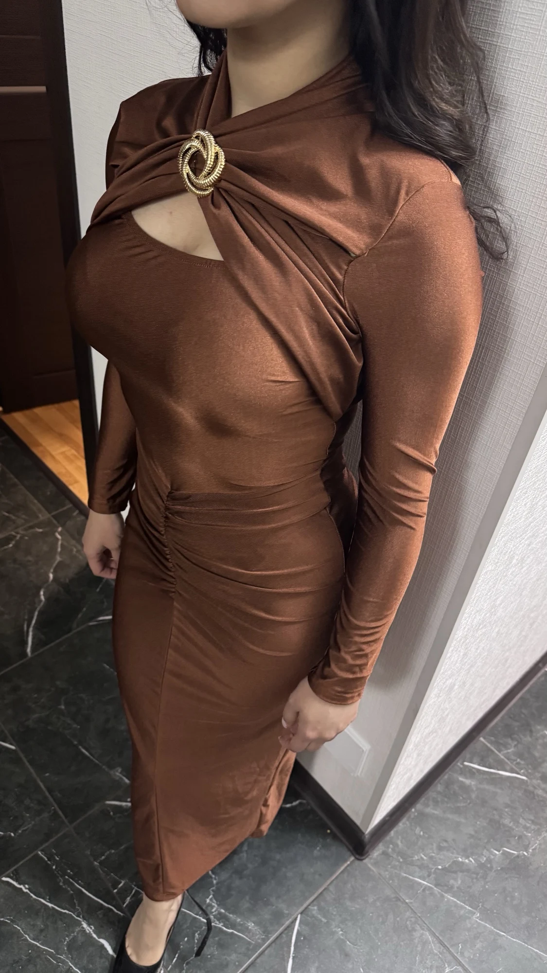 Questo abito lungo con maniche lunghe unisce eleganza e sensualità in perfetto equilibrio. Il design con scollo tondo, dettagli cut-out e fibbia metallica frontale dona un tocco audace e moderno, ideale per eventi serali, cene o party invernali.