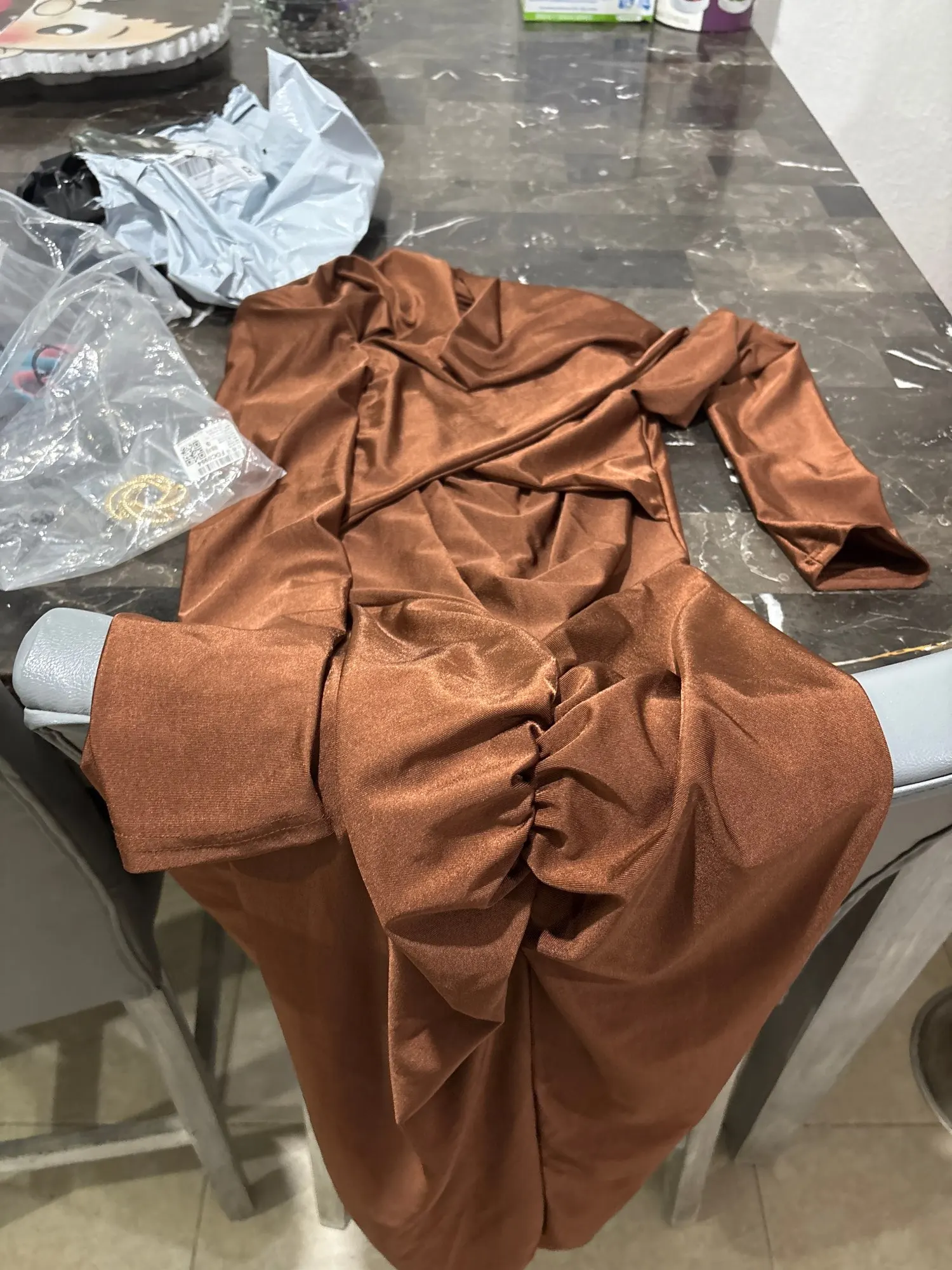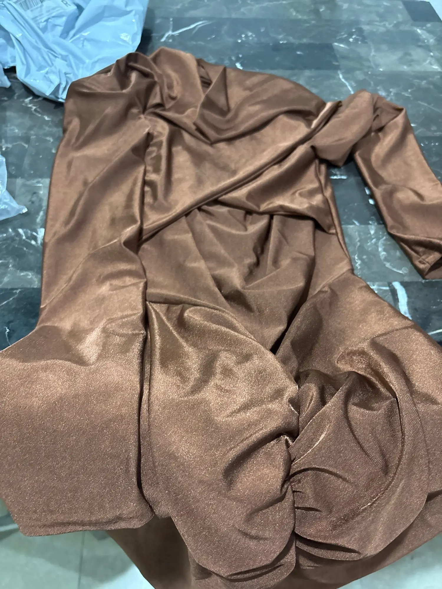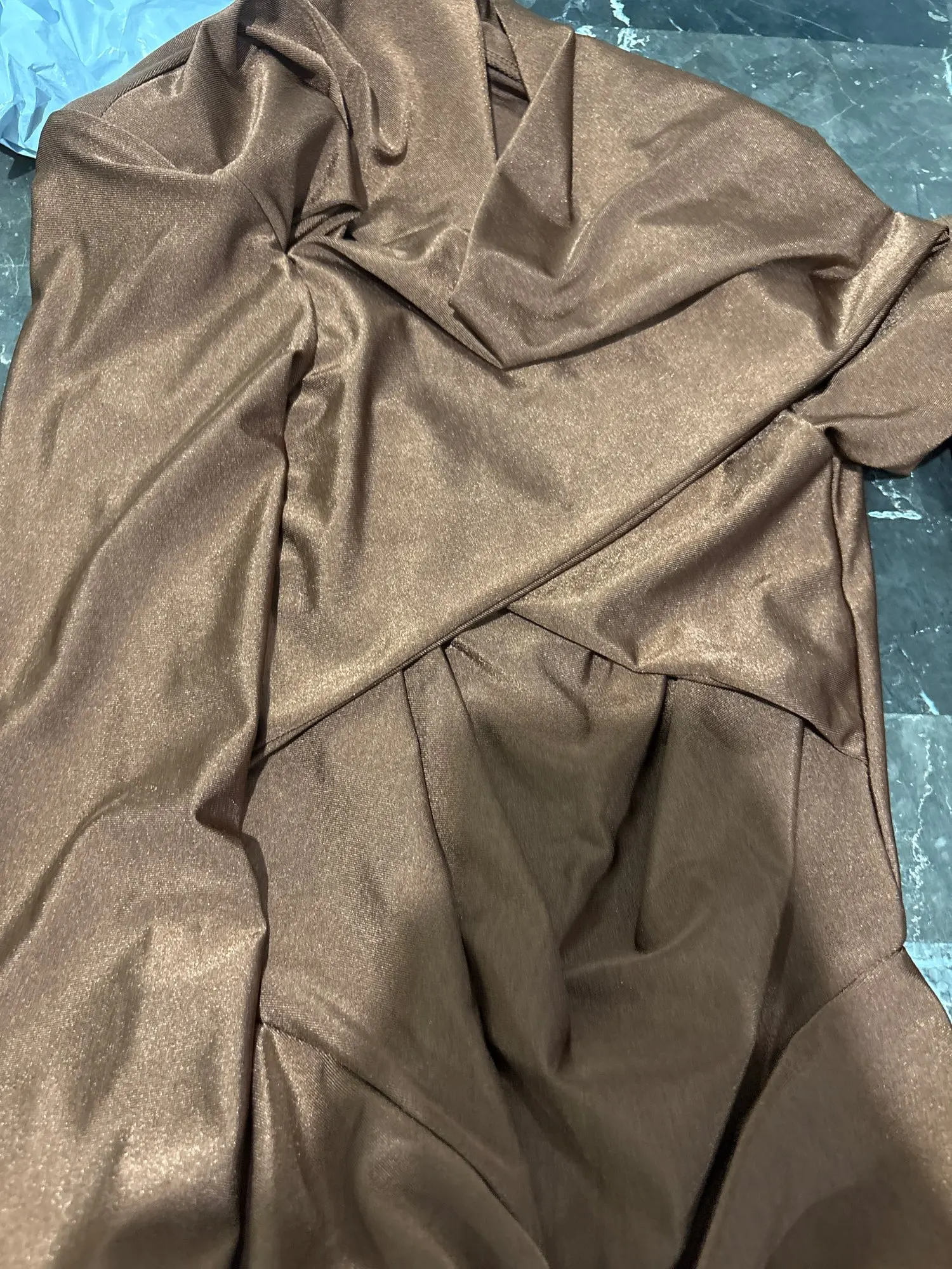L'abito è realizzato in un tessuto di alta qualità composto al 95% da poliestere e al 5% da elastan per garantire morbidezza, un drappeggio elegante e una vestibilità comoda e leggermente elastica.